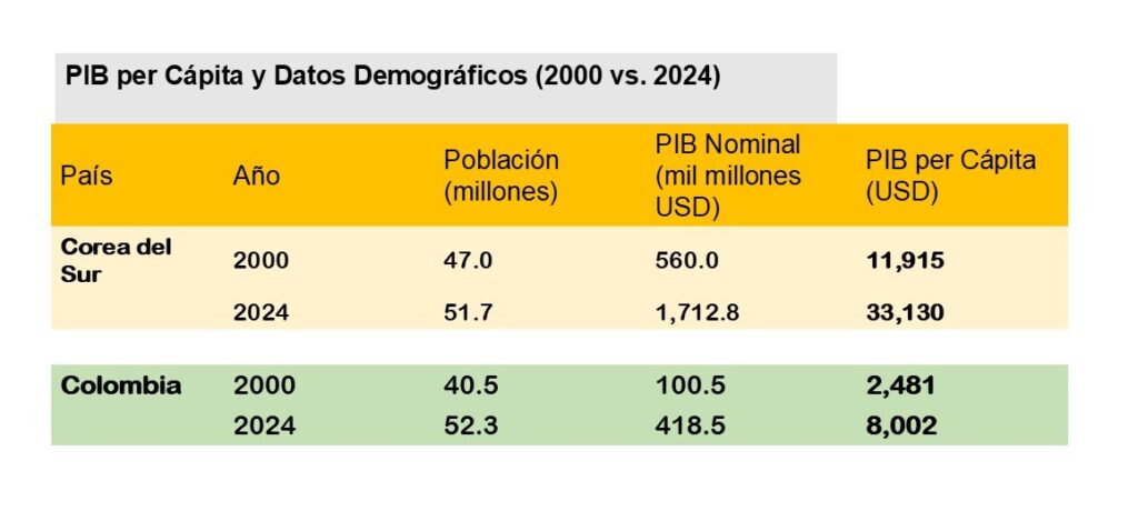Se trata de Corea del Sur y Colombia, ambos con alrededor de 50 millones de habitantes. Los primeros registran para el 2024, un ingreso per cápita, de US$33.130,oo; los segundos, US$8.002,oo.